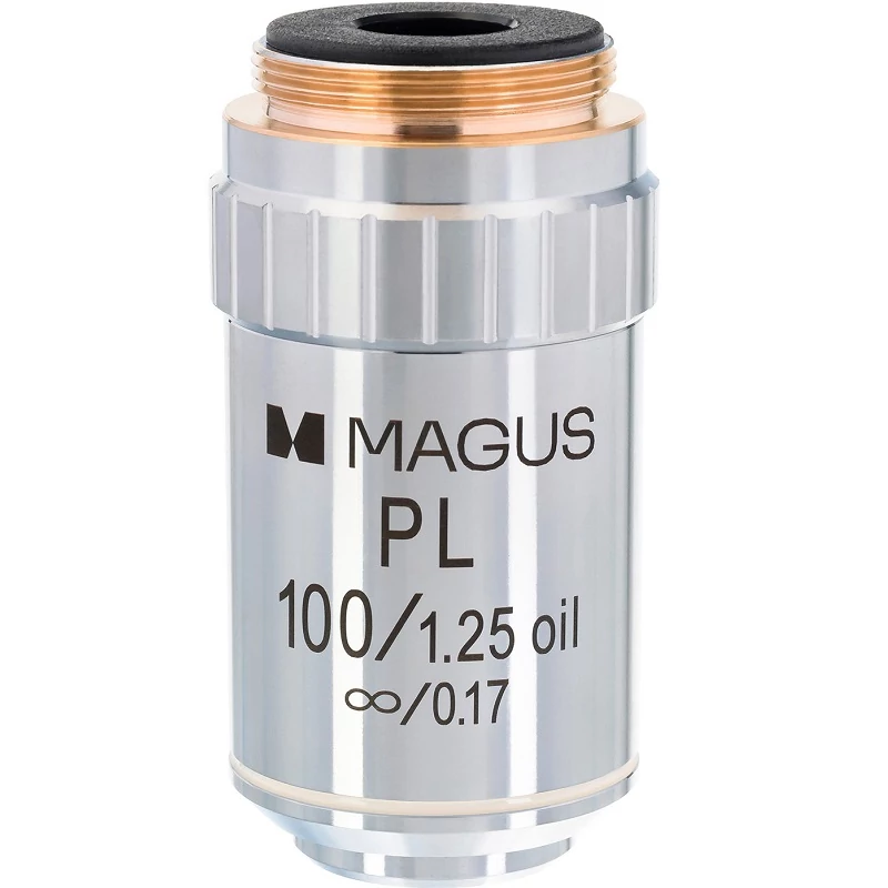 Világos látóterű megfigyelésre alkalmas objektív. A 100x/1,25 objektív felbontási határa 0,22 μm. A kromatikus aberráció a kék és a piros, a szférikus aberráció a zöld esetében, a látómező görbülete pedig a látómező átmérőjének 90%-ában korrigálódik.