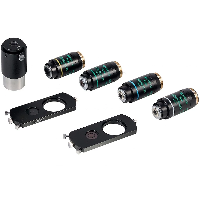 A fázisobjektívek abban térnek el a szabványos objektívektől, hogy fázisgyűrűvel rendelkeznek a kilépő pupilla síkjában. A sík-akromatikus fázisobjektívek olyan képet alkotnak, amely azonos fókuszt biztosít a középpontban és a széleknél is, így a torzítás elenyésző. A kromatikus aberráció a kék és a piros, a szférikus aberráció a zöld esetében, a látómező görbülete pedig a látómező átmérőjének 90%-ában korrigálódik. A 10x objektív használható fedőlemezes vagy anélküli mintákhoz is. A 20x, 40x és 100x objektív 0,17 mm-es fedőlemezzel rendelkező minták megfigyelésére szolgál. A 100x objektív támogatja az olajimmerziós technikát. Az objektíveket végtelenre korrigált tubushosszúságra tervezték. A parfokális távolság 60 mm.