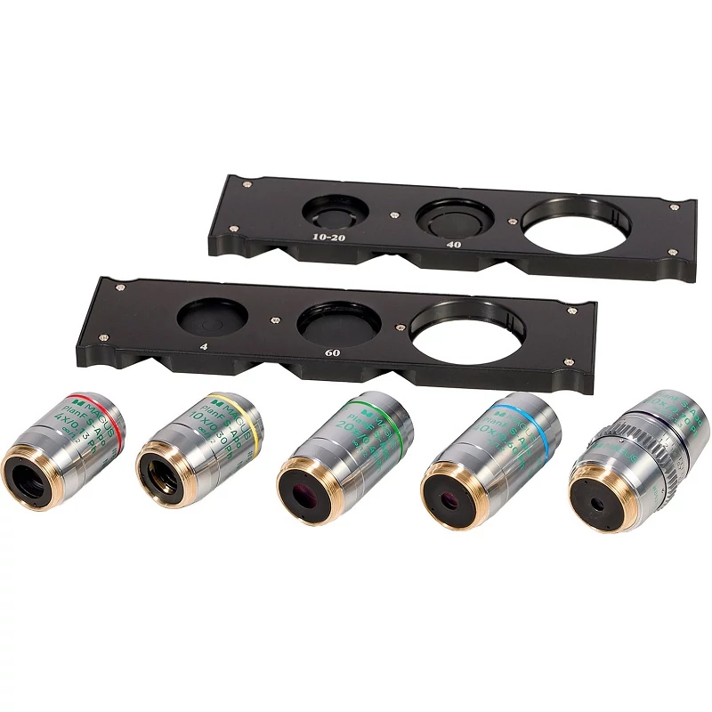 A fázisobjektívek fázisgyűrűvel rendelkeznek a kilépő pupilla síkjában. Eltérő szintű aberrációkorrekcióval rendelkeznek a mikroszkópkészletben található fázisobjektívekhez képest. A sík fél-apokromatikus objektívek a kromatikus aberrációkat négy szín esetében, a szférikus aberrációt három szín esetében, a látómező görbületét pedig a látómező átmérőjének 90%-ában korrigálják. A szemlencsében és a digitális fényképezőgépen látható kép tisztább, nagyobb kontrasztú és erősebb fényű mint a szokásos sík akromatikus objektívvel. A 4х, 10х, 20x és 40x objektívek 1,2 mm-es fenékvastagságú edényekhez, ill. az ezekkel való való munkához használhatók. A 60x-os objektív korrekciós gyűrűvel rendelkezik. A gyűrű forgatása módosítja az objektív belső lencséi közötti távolságot – az objektív optikáját a 0,1 mm és 1,3 mm közötti fenékvastagságú edényekhez állítva. Az objektíveket végtelenre korrigált tubushosszúságra tervezték. A parfokális távolság 60 mm.