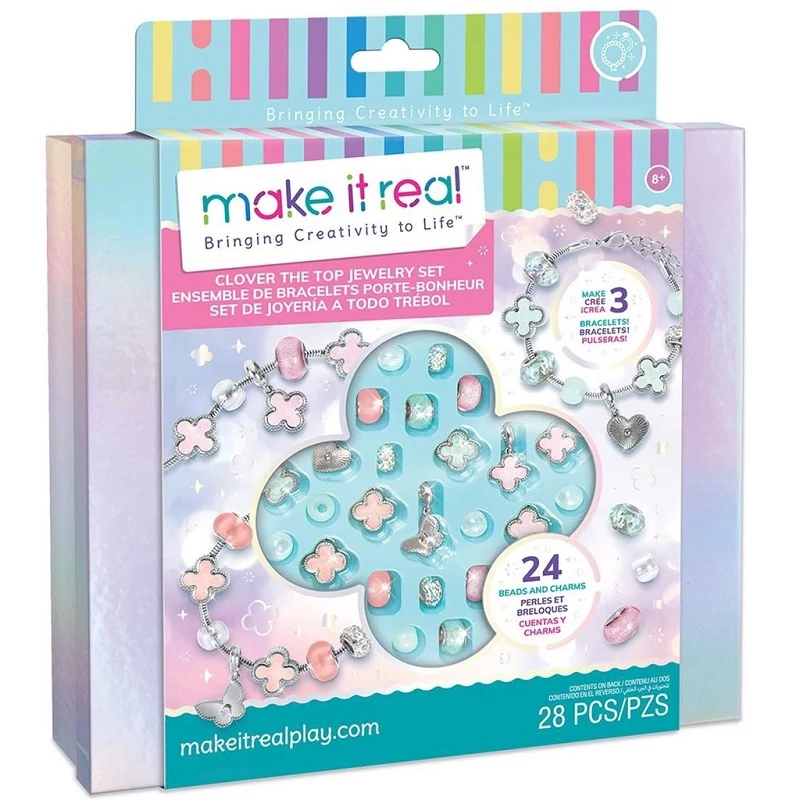 Hozz létre varázslatos karkötőket, amelyek nemcsak szépséget, hanem egy kis szerencsét is hoznak! A Make It Real: Négylevelű szerencse karkötők készlettel a gyerekek három saját ékszert alkothatnak meg, tele csillogással, bájjal és kreativitással. A szett különlegessége a négylevelű lóhere alakú gyöngyökben rejlik, melyek a szerencse szimbólumai – így minden egyes karkötő személyes üzenetet is közvetít.
