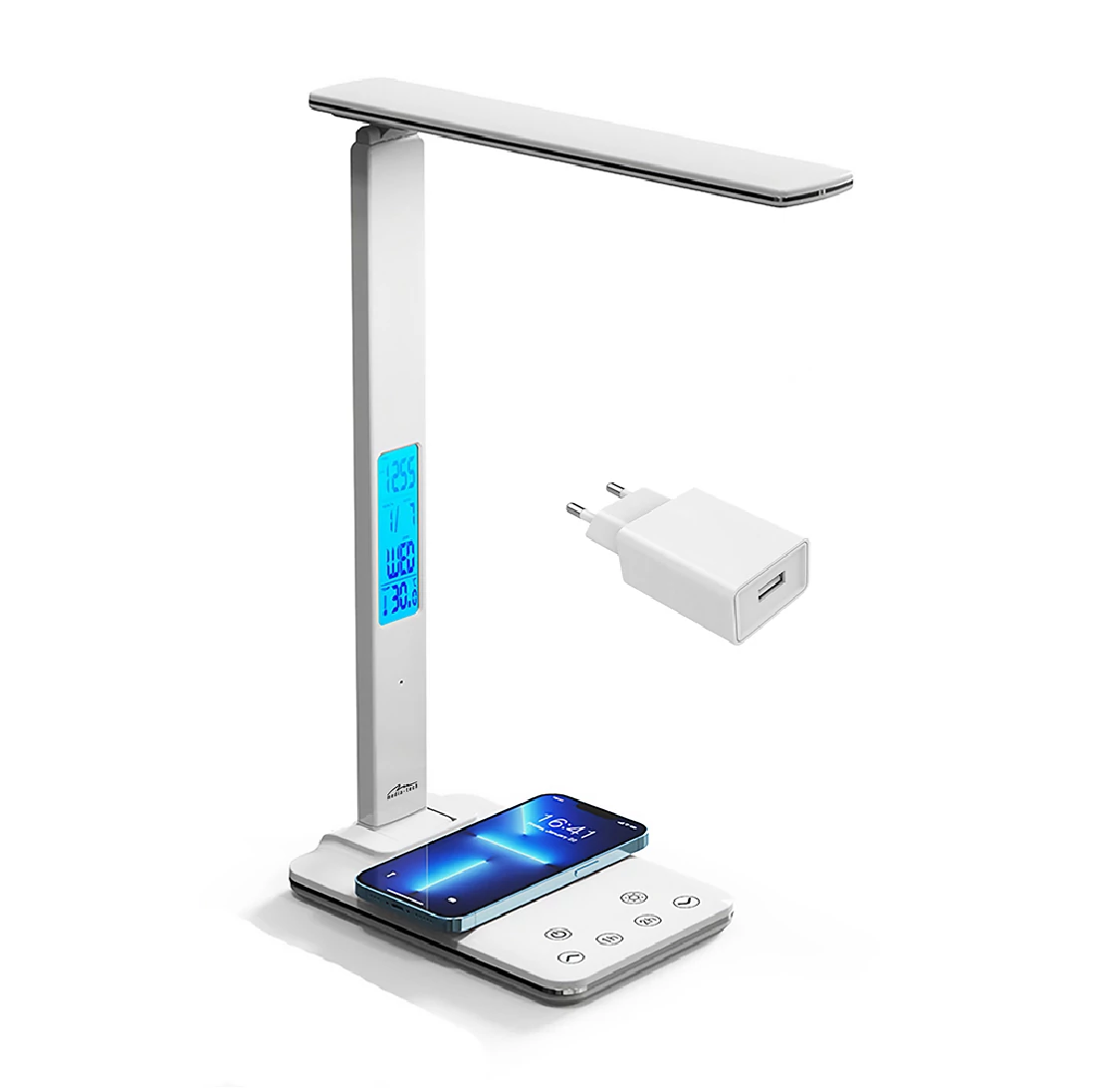 - Energiatakarékos LED asztali lámpa 15 W-os induktív töltővel. Megvilágított ébresztőóra C/ F hőmérővel.