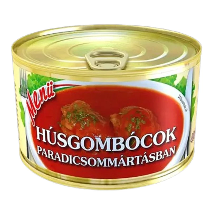 - ivóvíz, húsgombócok 24 % [baromfihús 53%, ivóvíz, rizs, marhahús 10%, zsemlemorzsa (búzaliszt , ivóvíz, élesztő, étkezési só, sütőipari keverék [búzaliszt , emulgeálószer: E472e, csomósodást gátló anyag: E170, lisztkezelőszer: E300]), étkezési só, fűszerek], sűrített paradicsom 12 %, cukor, gyorsfagyasztott zeller , búzaliszt , napraforgó étolaj, módosított kukoricakeményítő, étkezési só, vöröshagymapép (vöröshagyma, étkezési só, napraforgó étolaj), ételízesítő.