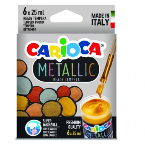 A Carioca nagyszerű Metallic termékcsaládjában végre elérhetőek a temperák is. A Metallic termékcsalád különlegessége, hogy minden egyes termék különleges metálos színnel rendelkezik. A nagy fedőképességnek köszönhetően ezek a temperák akár sötét felületeken is könnyedén használhatók, szemben a hagyományos termékekkel. A temperák alapanyaguknak köszönhetően könnyedén kimoshatók a ruhákból és lemoshatók a nem kívánatos helyekről. Kicsik és nagyok számára egyaránt remek szórakozást biztosítanak majd.