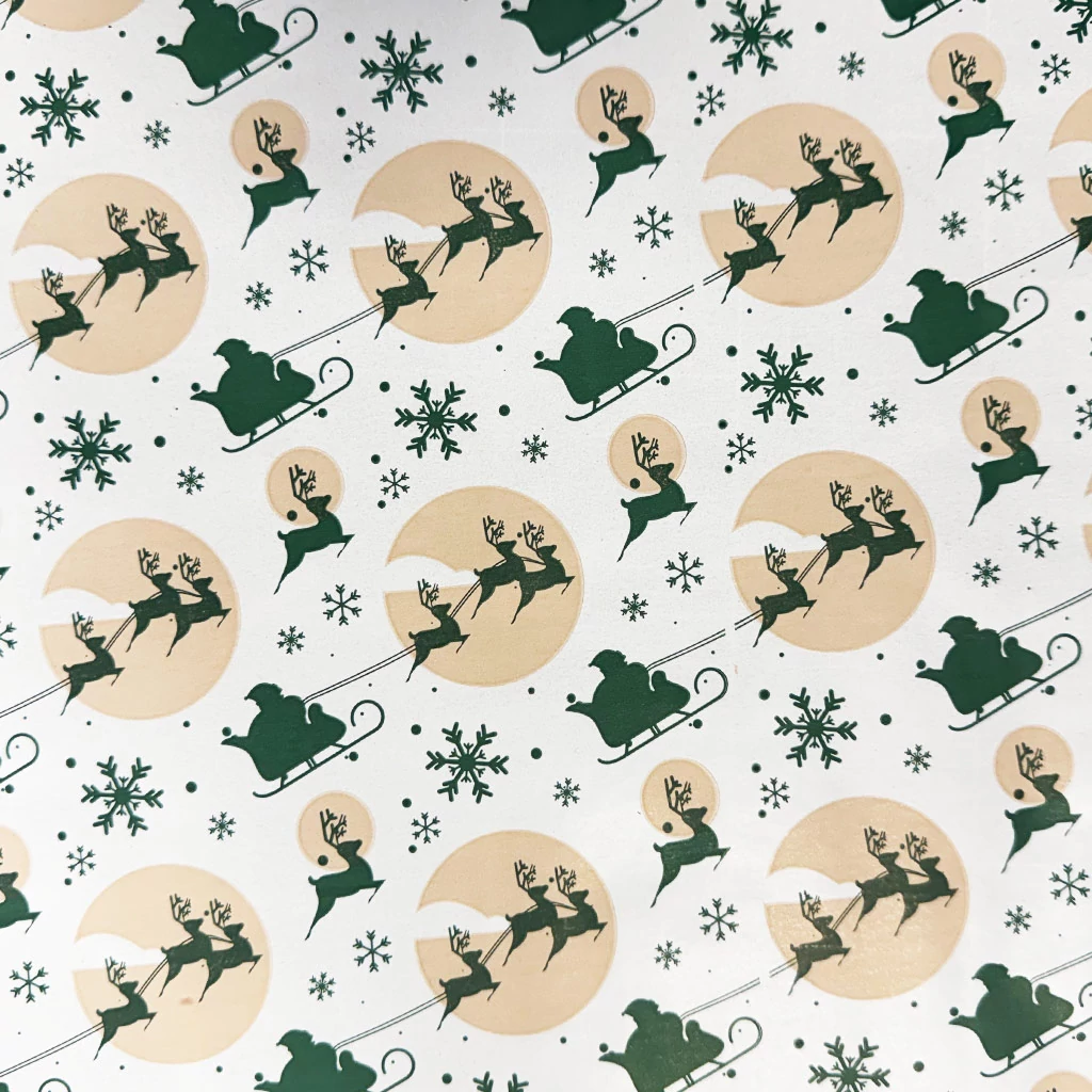 Vidd el az ajándékozást egy varázslatos éjszakai kalandra ezzel a különleges „Santa’s Sleigh Ride” csomagolópapírral! A klasszikus ünnepi hangulatot idéző mintán Mikulás szánja repül át a telihold előtt rénszarvasok húzta lendülettel, miközben hópelyhek és csillagok teszik teljessé a látványt. A zöld és arany színvilág harmonikusan kiegészíti egymást a fehér alapon, így elegáns, mégis játékos összhatást teremt.