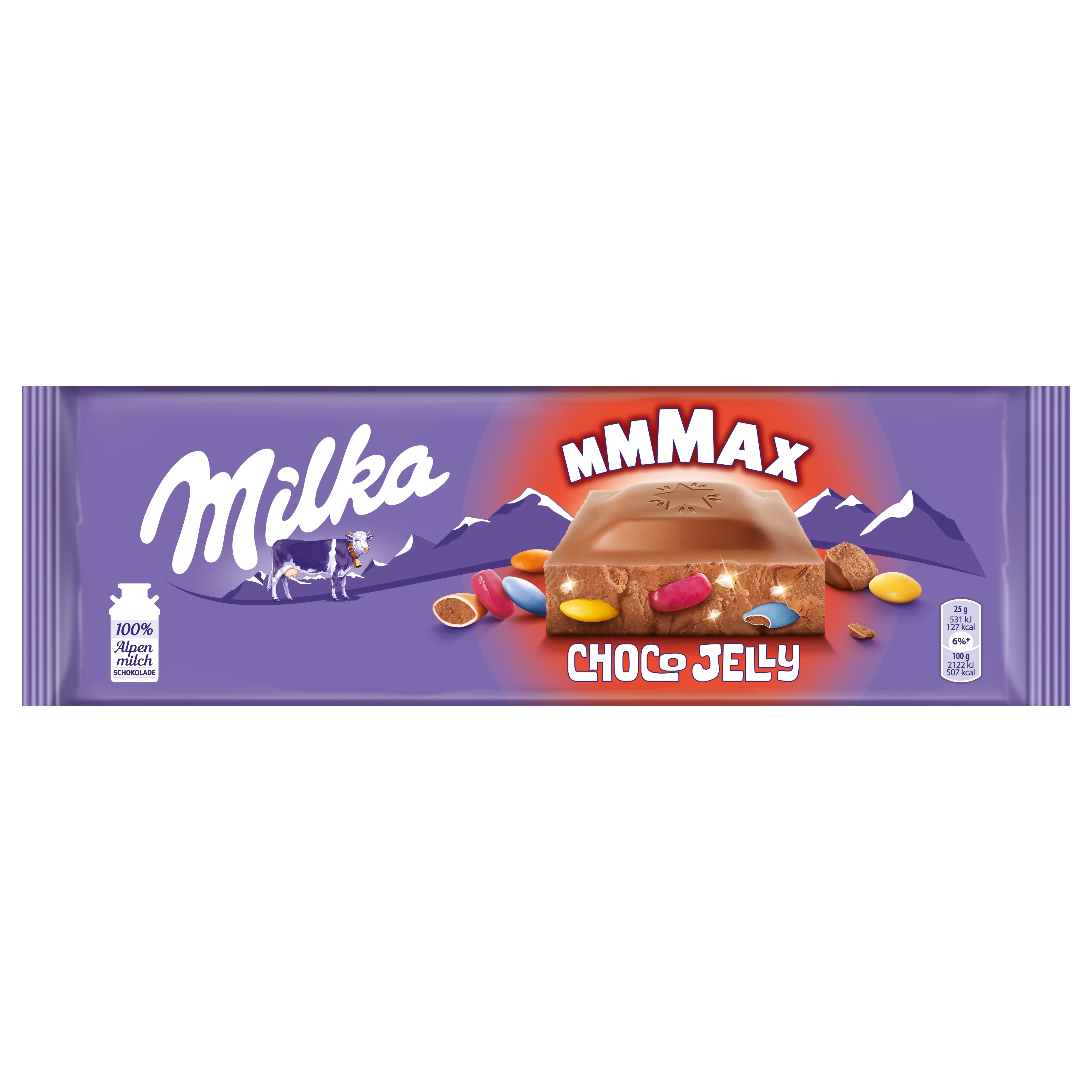Alpesi tej felhasználásával készült tejcsokoládé meggyízű zselédarabkákkal (7%), kakaós töltelékű színes cukordrazséval (6%) és robbanócukorkával (4%).