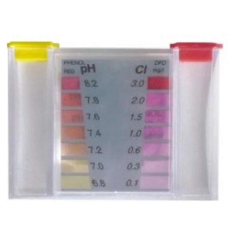 - Jellemzők: kompakt, kétoszlopos mérőedény (bal oldali pH, jobb oldali klór), fedéllel ellátott vízoszlopok, színskálával összehasonlítás, pontosabb mint a tesztcsíkok