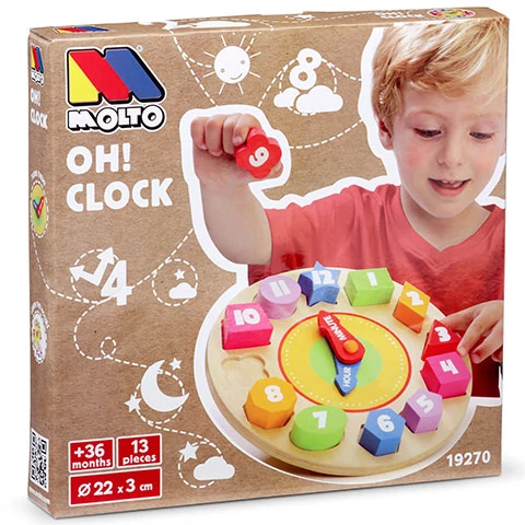 Ez a készségfejlesztő játék sok érdekes dologra megtanítja a gyereket, a különféle formáktól kezdve a színeken keresztül a számok világáig. Az egész játék fából készült, így strapabíró és hosszú élettartalmú. Az óra alapból az egyes elemeket egyetlen mozdulattal ki lehet önteni, és utána kezdődhet is a játék. A gyerekek megpróbálhatják a formájuk szerint a megfelelő helyre illeszteni az egyes darabokat. Minden darab csak a saját helyére illik be, így nagyon figyelmesnek kell lenniük. A számok és a színek a gyerekek segítségére lehetnek, ha megismerkednek velük. A játék kiválóan fejleszti a gyerekek finom-motorikus készségeit, a szín- és formafelismerésüket valamint bevezeti őket a számok világába, és a mutatós órákról való idő leolvasását is elsajátíthatják.