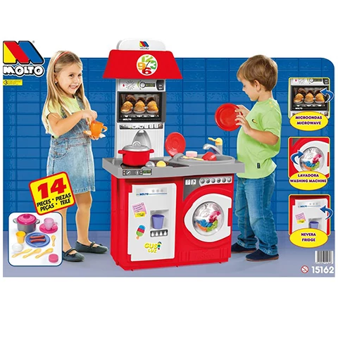 Ez a nagyszerű készlet minden gyerekszobából egy szuper kis konyhát képes varázsolni a gyerekek legnagyobb örömére, hiszen majd minden gyerek örömmel utánozza le a felnőttek tevékenységeit, és ez alól a sütés-főzés sem kivétel. A piros színű konyha igazán jól fel van szerelve, hiszen edényeket és evőeszközöket is kapunk hozzá, de nem hiányozhat a beépített sütős sem, ahogy az alsó részben egy fagyasztó és egy mosógép is ki lett alakítva. A játékkonyhák nem csak nagyszerű játékélménnyel ajándékozzák meg a gyerekeket, hanem segítenek nekik megérteni és elfogadni a mindennapi háztartási munkafolyamatokat is.