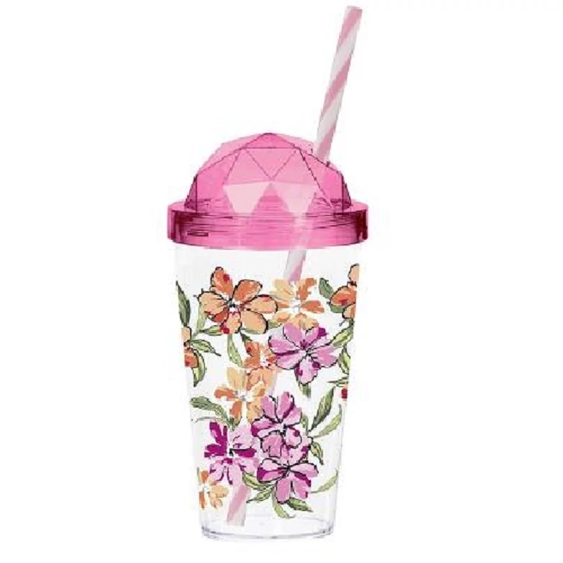 Műanyag pohár tetővel és szívószállal virágos 660ml SO569