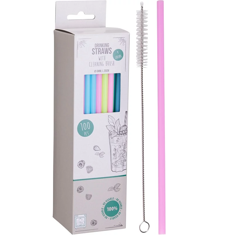Praktikus, eldobható színes műanyag szívószálak 100 darabos csomagban, ideális bulikhoz, koktélokhoz, üdítőkhöz vagy gyerekeknek, többféle élénk színű változatban.