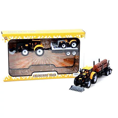 Ebben a szuper készletben rönkszállító, valamint mini munkagépszállító is a rendelkezésükre áll a kicsiknek a játék során, így a különböző munkafolyamatokhoz más és más pótkocsit vehetnek igénybe. A sárga munkagépek lendkerekes meghajtással rendelkezik, valamint az elején homlokrakodó is segíti a rakodást játék közben. A 3db rönkfa és a mini munkagép is nehéz rakomány, így a gyerekeknek óvatosan kell majd manőverezniük az utakon.