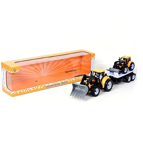 Egy remekül használható munkagép szettel lehet teljes a játékélmény a kis építkezők számára, hiszen ezzel a szettel nem csak egy, hanem rögtön két járgányt is használatba vehetnek. a jellegzetes sárga színű munkagéphez ugyanis egy csatlakoztatható pótkocsi tartozik, melyen egy kisebb méretű, homlokrakodóval felszerelt gép tartozik. A lendkerekes járgánnyal izgalmas játékélmény lesz a rakodás és a munka további fázisai is.