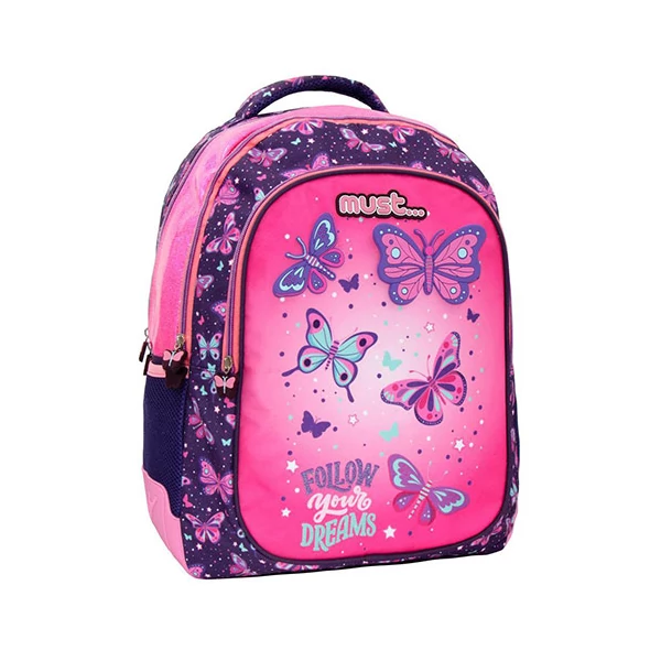 Must... Follow your dreams Pillangós lekerekített háromrekeszes iskolatáska, hátizsák 32x18x43cm
