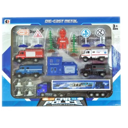 Ez a fantasztikus szett minden szükséges járművet tartalmaz az izgalmas játékhoz. A rendészeti- és mentőegységek közül az összes szervezet teherkocsijai felvonulnak és a készlet még egy rendőrségi épületet is tartalmaz. A kiegészítők közt megtalálható egy figura, bóják az útlezárásokhoz, táblák és még 2db fa is. A szett legtermetesebb tagja a jókora nyergesvontatós kamion, mely látványos grafikával van ellátva a pótkocsiján.