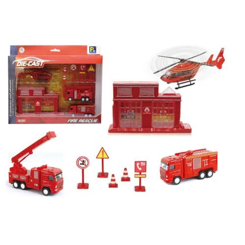 Ez a fantasztikus játékszett minden szükséges kiegészítőt tartalmaz ahhoz, hogy a gyerekek igazi tűzoltónak érezhessék magukat játék közben. A készletben megtalálható a létrás és a locsoló tűzoltókocsi, melyeknek a helikopter nyújthat légi támogatást a tűzesetek felderítésében. A készletben megtalálható a tűzoltóság épülete is, valamint az olyan kiegészítők, mint a forgalomterelő táblák és útjelző bóják, amik a valóságban is a tűzoltók segítségére vannak a munkában.
