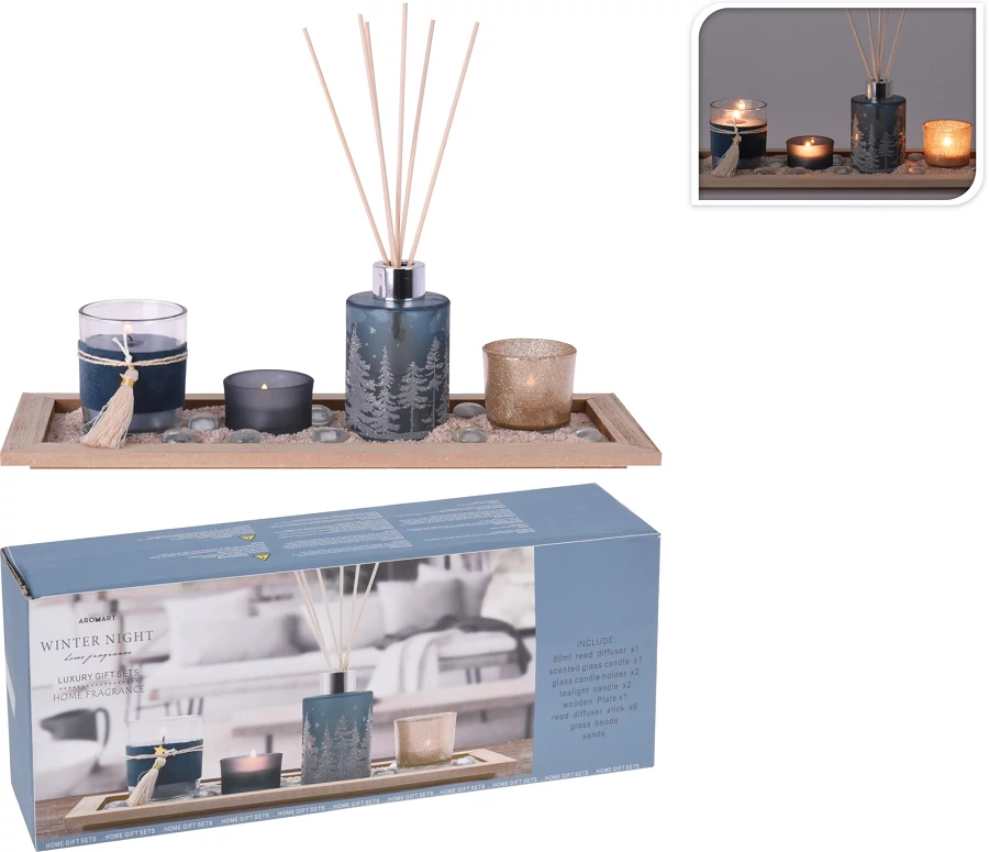 A gyönyörű téli szett nagyszerű kiegészítője lesz a belső térnek. Megtalálható benne egy diffúzor, gyönyörű fa motívummal, egy üveggyertya és két teamécses tégely.
