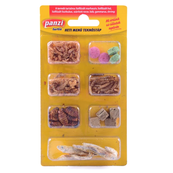 - tartama: hét különböző teknős csemege ( liofilizált marhaszív, liofilizált hal, liofilizált lisztkukac, szárított rovar, báb, gammarus, shrimp