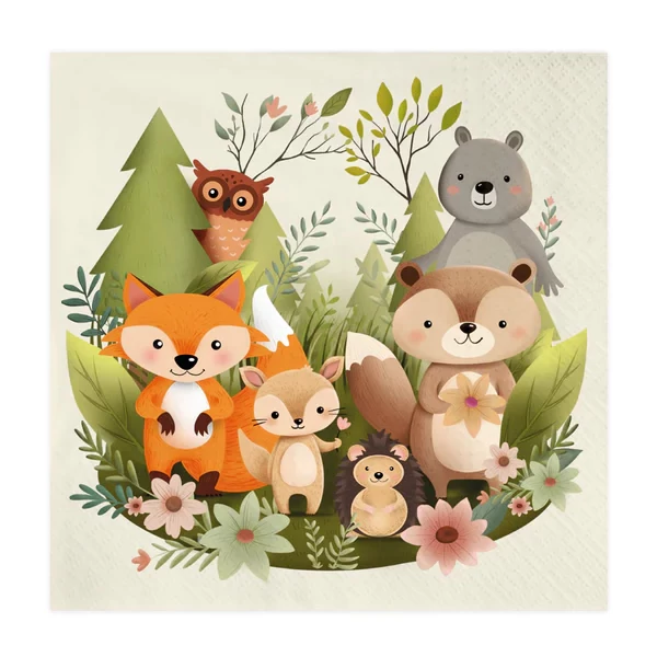 Terítsd meg a parti asztalt aranyos erdei állatok mintás szalvétákkal. Cuki süni, róka, maci, bagoly, mókus minta biztosítja a jókedvet egy gyerekzsúron. Az erdőben élő állatok rajongóinak kötelező beszerezni ezt az állatos szalvétát egy szülinapi bulira vagy gyereknapra. Használd terítéskor a 10 darabos, 33 cm x 33 cm nagyságú erdei állat mintás papír szalvétákat. Ha több gyermek lesz a partin akkor célszerű beszerezned még egy csomaggal. Az erdei állatos szalvétát hajtsd háromszög alakban vagy bevethetsz különböző hajtogatási technikát is így még látványosabb lesz az asztal dekorációja. Használatával a gyerekek arca nem lesz maszatos. Válaszd mellé a kollekció további party kellékeit pl. erdei állatok party pohár, tányér, csákó, szívószál, szülinapi felirat és erdei állatos lufi. Így lesz teljes és emlékezetes az erdei állatos parti dekorációja.