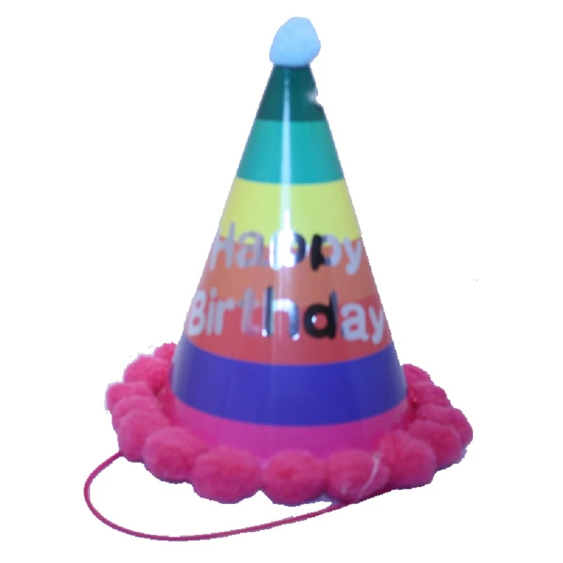Party kalap, szivárvány happy birthday felirattal, pöttyös mintákkal, bojtokkal a szélén. Hozzáadott gumival rögzíthető a fejre.