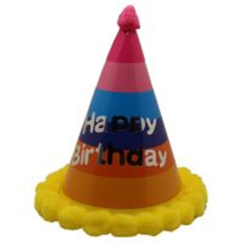Party kalap, szivárvány happy birthday felirattal, pöttyös mintákkal, bojtokkal a szélén. Hozzáadott gumival rögzíthető a fejre.