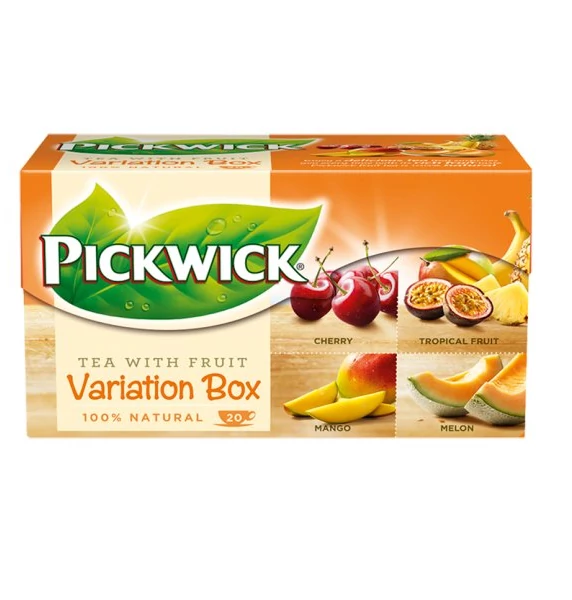 - A Pickwick ízesített fekete tea lágy, gyümölcsös ízével kényeztet, melyet a természetesen édes, valódi gyümölcsdarabok tesznek különlegessé. Egy variáció a nyári és egzotikus ízek szerelmeseinek válogatva a fekete tea karakteres aromájának ölelésében. Ez a doboz a következő ízeket tartalmazza: Meggy / trópusi gyümölcs / Mangó / Sárgadinnye. A doboz 20 filtert tartalmaz, minden egyes csésze teához egy filter ajánlott. 100% természetes. Koffeint tartalmaz. Telt ízű.