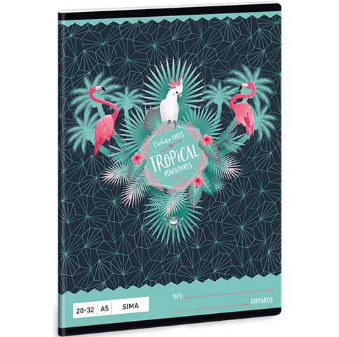 A Tropical adventures sima füzet türkis színű hátterén kedves flamingók és egy fehér papagáj is megjelenik, amely igazán divatos megjelenést kölcsönöz használója számára az iskolai mindennapok során. A füzet 200 grammos műnyomó karton borítója lakkozott felülettel rendelkezik, amelynek köszönhetően füzetborító nélkül is használható. A jobb alsó sarokban feltüntetheted gyermeked nevét, osztályát és a tantárgyat, nem szükséges további füzetcímke használata. 32 lapos kialakításának köszönhetően hosszú ideig egyetlen füzetben folytathatja tanulmányait, így egy helyen tarthatja a fontos feljegyzéseit, képleteit. A füzet lekerekített sarkokkal rendelkezik annak érdekében, hogy elkerülhesd a gyűrődések és a szamárfülek kialakulását.