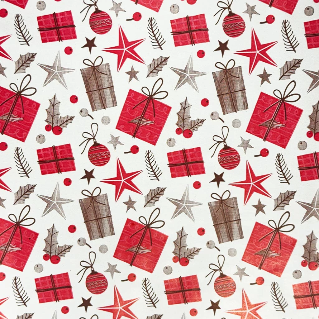 Tedd igazán ünnepivé a karácsonyi ajándékokat ezzel a látványos és stílusos „Red Festive Joy” csomagolópapírral! A papír minden négyzetcentimétere a klasszikus karácsonyi hangulatot idézi: piros és barna ajándékdobozok, csillagok, bogyók, fenyőágak és ünnepi gömbdíszek ismétlődnek egy fehér alapon, megteremtve a tökéletes ünnepi összhangot. A változatos minták játékosak, mégis harmonikusak, így a becsomagolt ajándék már első pillantásra különleges élményt nyújt.