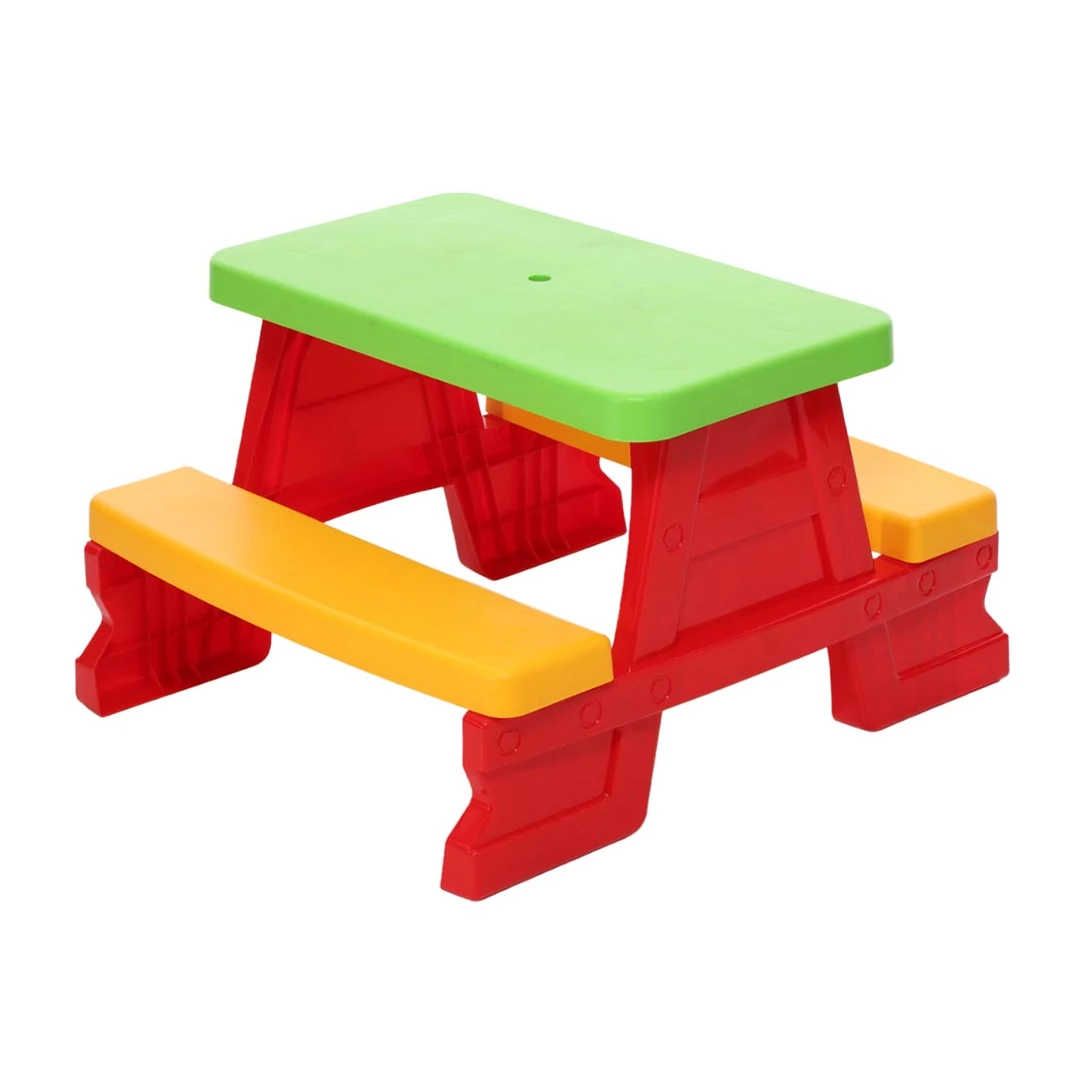 Ez a vidám, piros színű piknikasztal tökéletes választás kisgyerekek számára, akik imádnak együtt játszani, kézműveskedni vagy akár uzsonnázni. A strapabíró műanyagból készült asztal két sárga paddal és egy élénkzöld asztallappal rendelkezik, amely egyszerre biztosít stabil és kényelmes helyet akár négy gyerek számára. Kompakt méretének (70x79x47 cm) köszönhetően beltéri és kültéri használatra egyaránt ideális, így a nappaliban, a teraszon vagy a kertben is remekül megállja a helyét.