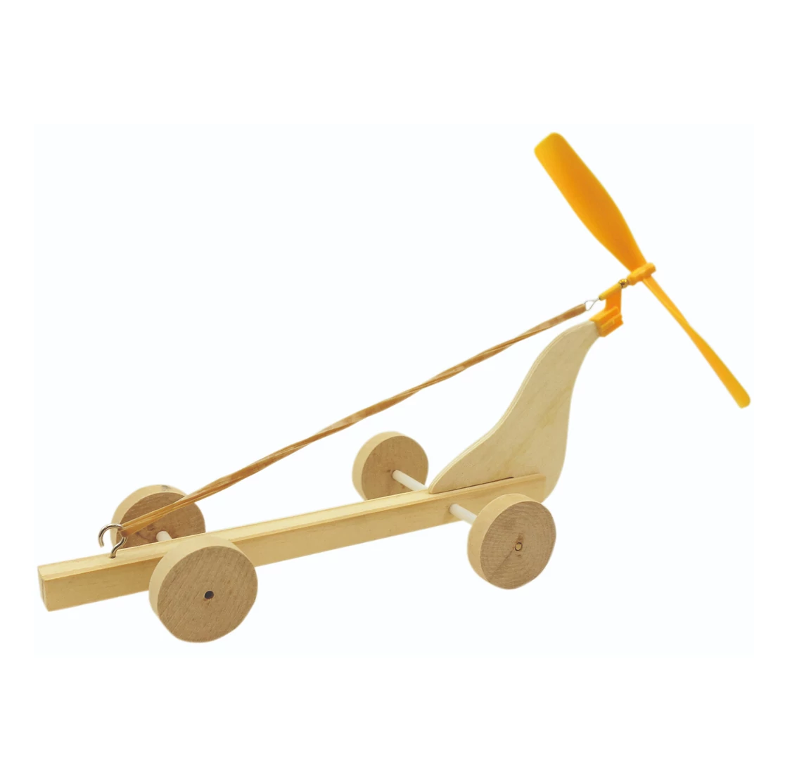 A propellert könnyen összeköthetjük az autóval a befőttes gumival, így mozgásra bírhatjuk az autót. Egyszerűen fel kell húznunk a propellert, ami hatására a gumi betekerődik, majd ha elengedjük, a gumi kitekeredve forgatja a propellert. Ez egy remek módja annak, hogy a gyerekek játék közben még jobban megismerjék az alapvető mechanikai alapelveket.