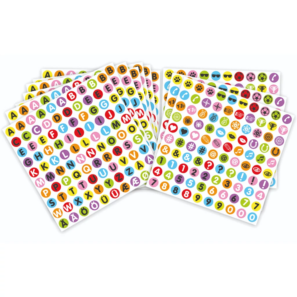A betűs és számos matrica szettben 10 lapnyi, összesen 1000 darab matrica található. Ezek a matricák különféle betűket, számokat és szimbólumokat tartalmaznak, melyek számos különböző színben pompáznak.