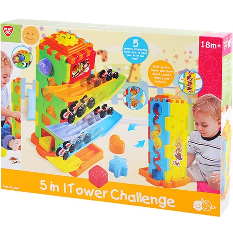 A kisbabák szem-, és kéz koordinációs készségeinek fejlesztése a Playgo változatos bébijátékaival móka és kacagás. Az 5 az 1-ben bébi készségfejlesztő toronyjáték azonnal magával ragadja a kicsiket színes, vidám kidolgozásával. A multifunkciós torony minden oldalán más, és más játékra bukkannak a gyerkőcök. A formabedobós játékba öröm lesz bedobálni a különböző színes alakzatokat, ami sikerélményt nyújt számukra. A torony többi oldalán egy szuper versenyautópályát, csörgős fogaskerék pályát, és egy macis zuhanójátékot találsz, melyeket a torony tetején elhelyezett csipogó hanghatással megalkotott napocska koronáz meg.