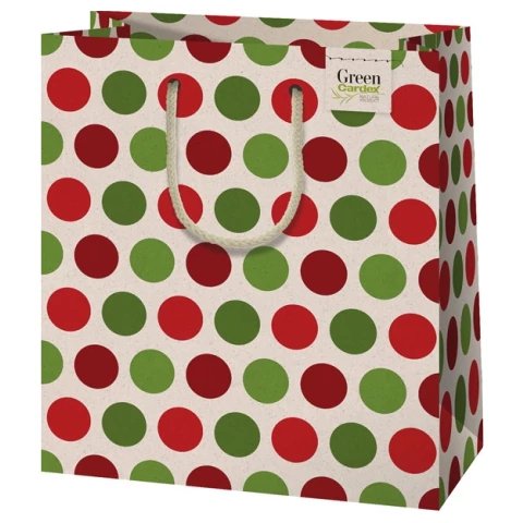 Ha egy igazán különleges és elegáns ajándéktáskában szeretnénk átadni meglepetésünket szerettünknek, akkor ez a pöttyös mintás környezetbarát díszzacskó lesz a tökéletes választás. A Cardex kiváló minőségű ajándéktáskái erős zsinór fülekkel és erősített talprésszel készülnek, hogy a nehezebb ajándékokat is könnyen és biztonságosan lehessen bennük szállítani. A táska anyaga környezetbarát, újrahasznosított papír.