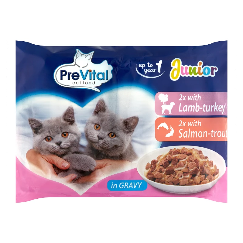 - PreVital Junior teljes értékű állateledel kölyökmacskák számára báránnyal és pulykával szószban 2 x 100 g e, PreVital Junior teljes értékű állateledel kölyökmacskák számára lazaccal és pisztránggal szószban 2 x 100 g e