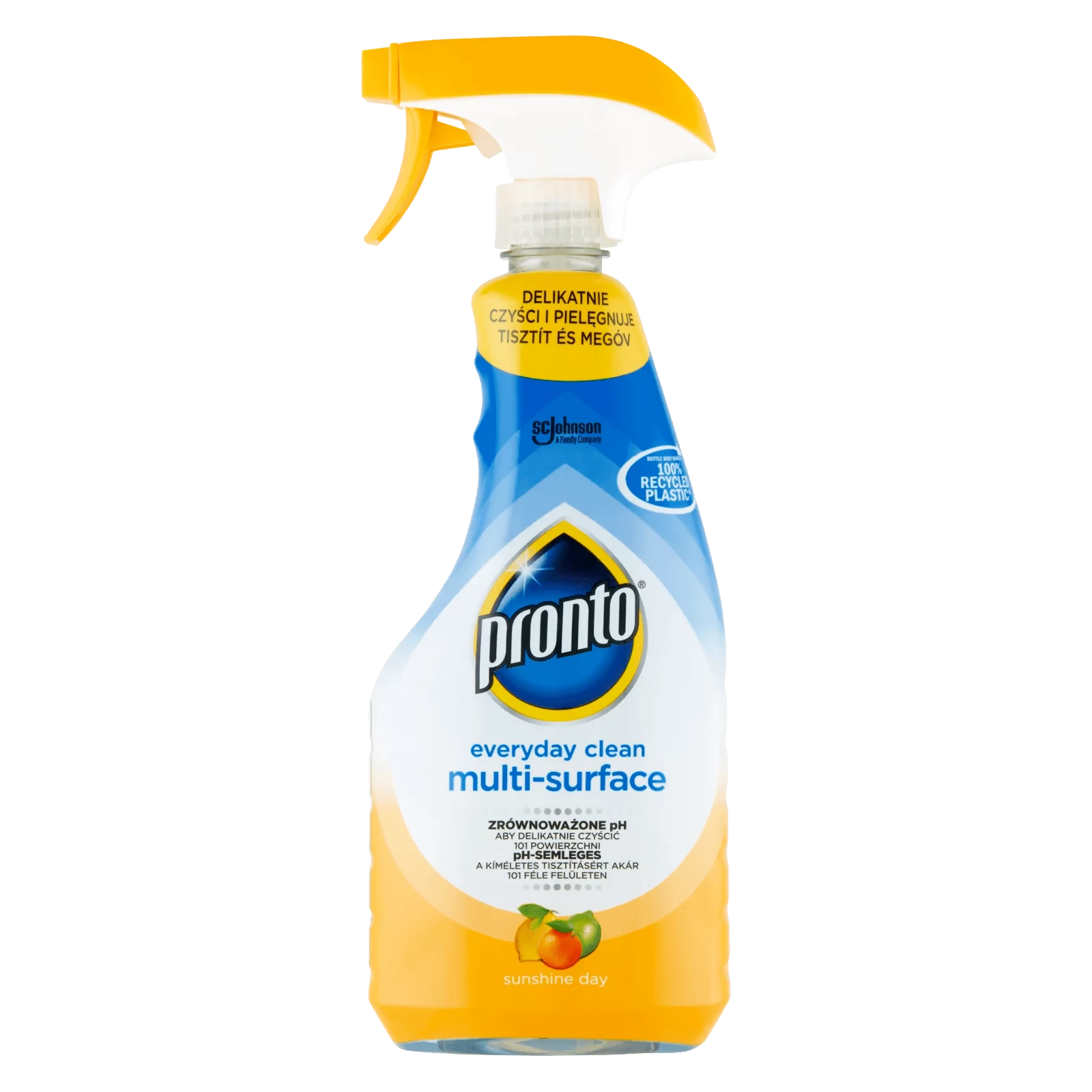 A flakon 100%-ban újrahasznosított műanyagból készült A Pronto Everyday Clean Multi-Surface általános felülettisztító spray semleges pH-értékű formuláját arra tervezték, hogy megbírkózzon a makacs foltokkal és szennyeződésekkel, de megfelelően kíméletes legyen mindennapi használat esetén is. Speciális formulája gyengéden eltávolítja a port és a szennyeződéseket anélkül, hogy kárt tenne a felületben, illetve csíkot vagy foltokat hagyna. Kiemeli otthona szépségét. Szilikonmentes termék.