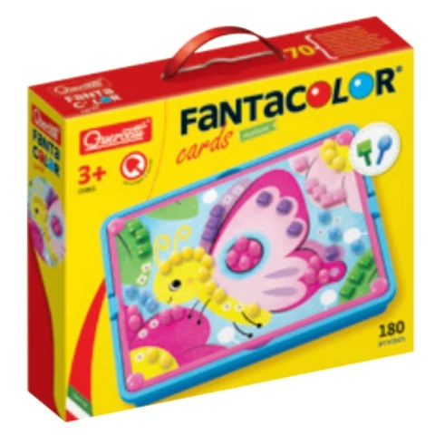 A Quercetti Fanta Color Cards játékszett már akár három éves kortól remek játékélményt nyújt a gyerekeknek. A szettben található táblára helyezhetők a különböző, természet vidám színeivel és mintáival ellátott kártyák, amiket aztán a megfelelő részeken dekorálni lehet a készletben található színes pötyikkel. A készlet összesen 130db-os, mely hosszú időre elegendő lesz a kicsik szórakoztatására és készségeik fejlesztésére.