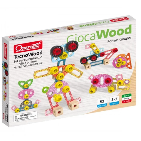 Használd fel ezeket az erős és ütésálló műanyag csavarokat és alátéteket, hogy több ezerféleképpen megalkosd a kedvenc dolgaidat. Ebben mindent megtalálsz ahhoz hogy robotokat, furcsa szerzeteket, épületeket és bármi mást megalkoss. A határ a csillagos ég és a kreativitásod. Fa és műanyag darabkái vibráló színekkel van kidíszítve ami felkelti a gyermekek kreatív gondolkodásvágyát és a kézügyességüknek a fejlődését. A mechanikai alapvető elveit is megtanítja nekik ez a kis egyszerű játék. Minden egyes darabot Olaszországban készítettek szigorú minőségi elvárásokat teljesítve és külön odafigyelést szentelve a biztonságos környezetre és az környezetünk megóvására.