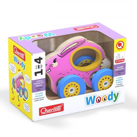 A Woody fajtájú kisautókkal biztos lehetsz a boldogságban és bárhová elvezethetsz velük, nem csak előre és hátra mehetsz hanem oldalra is közlekedhetsz a fatest elforgatásával. Az EVA habkerekek levehetőek és kimoshatóak és mindemellett a lehető legerősebb tapadást szolgálják kül- és beltérén egyaránt. Mindezt anélkül hogy nem roncsolják a felületet amin gurulnak és nem adnak ki hangot. Minden egyes Woody állat egyedi dizájnnal készült, hogy elősegítsék a kézügyesség fejlődését és a csukló kényelmes mozgását.
