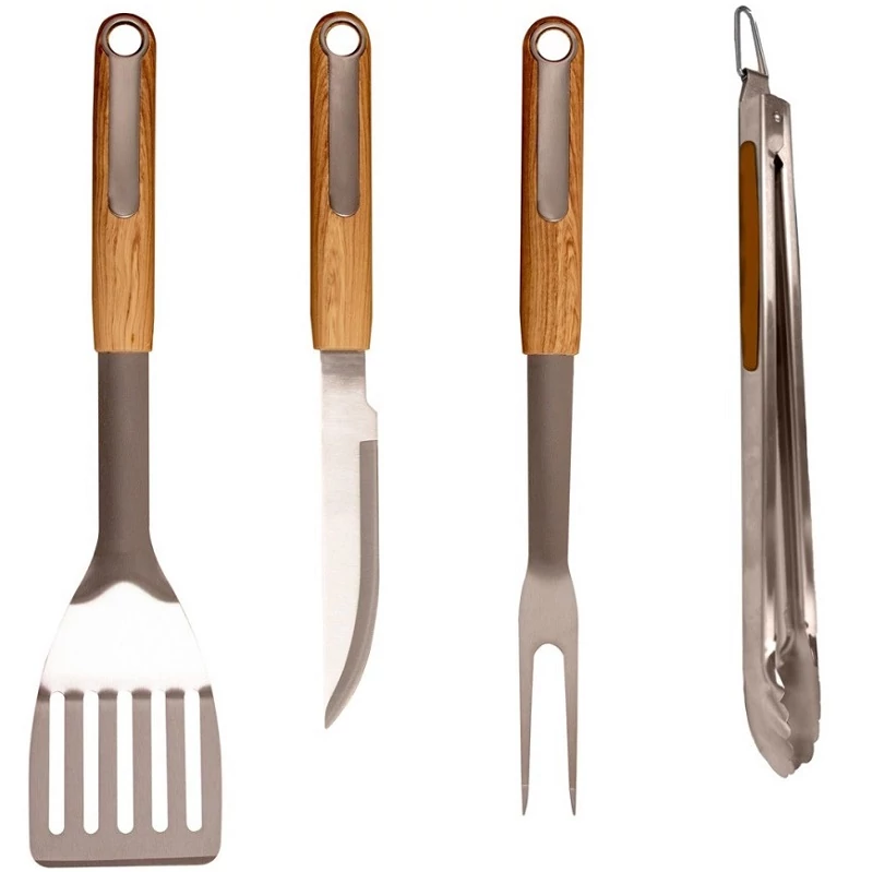 • a készlet a leggyakrabban használatos eszközöket tartalmazza – egy-egy széles forgatólapátot, hosszú villát, univerzális csipeszt és kést