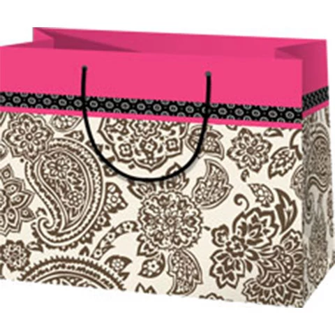 Amennyiben szeretnénk diszkréten átadni az ajándékokat az ünnepelt számára, azonban nem tudunk egy igazán szép és alkalomhoz méltó csomagolást csinálnia, akkor az ajándéktasak a legjobb választás. Ez a tasak csodálatos mintázattal, fekete díszítő csíkkal és rózsaszín felső szegéllyel biztos a lányok kedvence lesz. A nagy méretű, fekvő kialakítású ajándéktáska kiváló minőségű, telített színekkel készített nyomata szép megjelenést, míg a lakkozott vastag papír és az erős zsinórfüles kialakítás tartósságot kölcsönöz neki, hogy a benne lévő ajándékok biztonságban legyenek.
