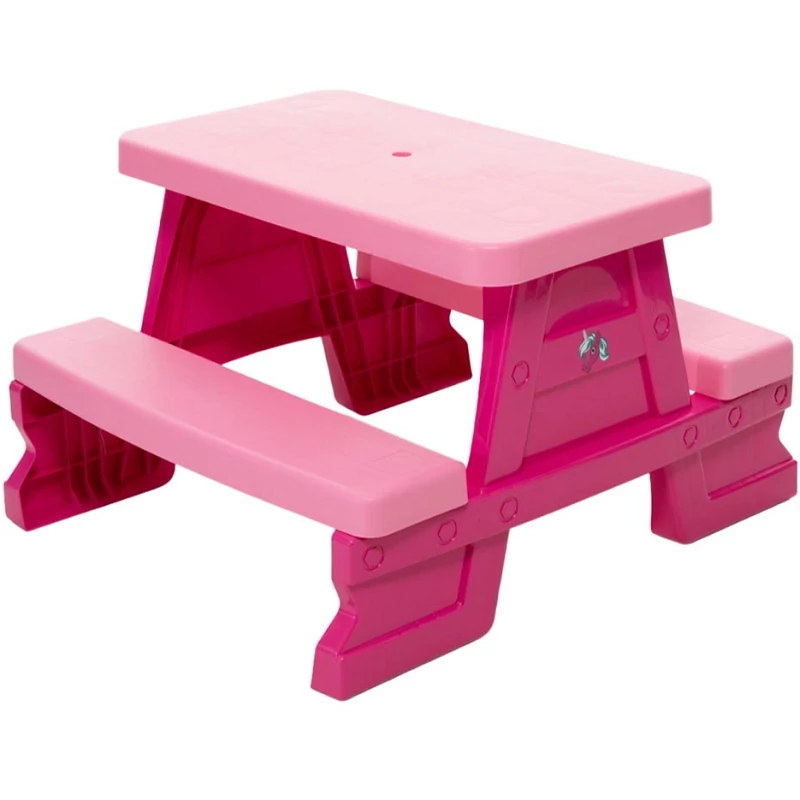 Ez a csodaszép, rózsaszín piknikasztal tökéletes választás a kis hercegnők számára! Az asztal élénk színei és praktikus kialakítása biztosítja, hogy a gyerekek kényelmesen és vidáman használják játékhoz, alkotáshoz vagy uzsonnához. Kompakt méretének (70x79x47 cm) köszönhetően könnyedén elfér a szobában, de a kertben is nagyszerűen megállja a helyét. Az asztallap közepén egy lyuk található, amely egy kis napernyő elhelyezését teszi lehetővé, így a melegebb napokon is árnyékban lehet a játék. Az asztal két oldalsó paddal rendelkezik, ahol akár négy gyerek is kényelmesen elfér egyszerre. A strapabíró műanyag kialakításnak köszönhetően rendkívül könnyen tisztítható és ellenáll a napi használatnak. Ideális választás lehet szülinapi bulikra, kreatív tevékenységekre vagy csak egy közös piknikhez a kertben.