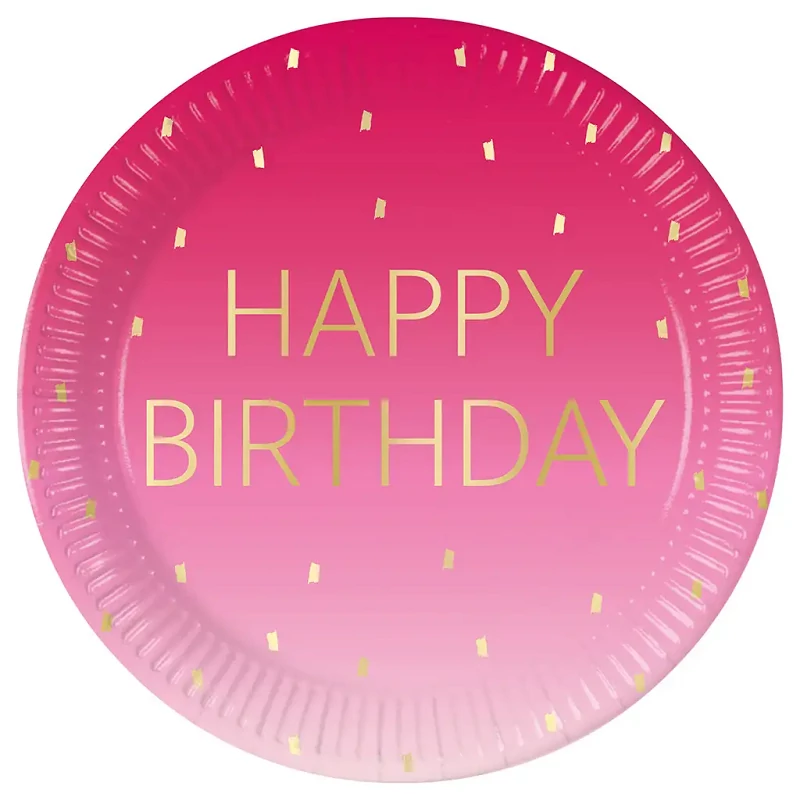 Tedd igazán különlegessé a születésnapi bulit ezekkel a stílusos, rózsaszín „Happy Birthday” papírtányérokkal! A tányér letisztult, mégis látványos dizájnnal készült: a színátmenetes rózsaszín alapot arany „Happy Birthday” felirat és vidám konfettiminta díszíti, amely eleganciát és ünnepi hangulatot visz bármilyen terítékbe. Tökéletes választás gyerekzsúrra, tini születésnapra vagy felnőtt bulira is.