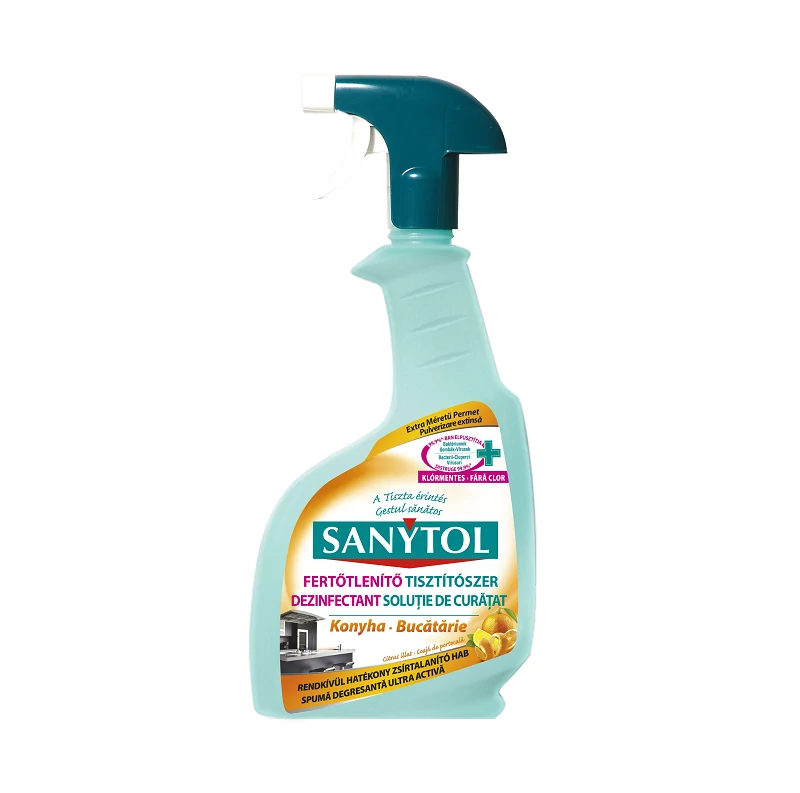 A kellemes citrus illatú Sanytol konyhai Fertőtlenítő felülettisztító spray megakadályozza a mikrobák elszaporodását, egyszerre fertőtlenít, és eltávolítja a zsíros szennyeződéseket. Kíméletes a felületekhez, megszünteti a kellemetlen szagokat. A Sanytol Fertőtlenítő Konyhai Spray hármas hatású: baktericid (5 perc alatt) és fungicid (15 perc alatt) az EN 13697 szabvány szerint, virucid az EN 14476 szabvány alapján a Herpes Simplex vírus és az influenza A H1N1 vírussal szemben. Hatása hitelesített laboratóriumi tesztek által igazolt. Bőrgyógyászatilag tesztelt.
