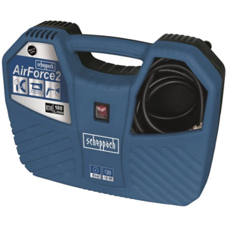Motor: 230 V/50 Hz Teljesítmény: 1100 W / 1,5 LE Max. nyomás: 8 bar Szívóteljesítmény: 180 l/perc Tápkábel: 5 m Magasnyomású tömlő: 3 m Méretek: 425 x 135 x 340 mm A Scheppach AIR FORCE 2 egy nagyon praktikus, helytakarékos, könnyű, ugyanakkor erős és sok funkcióval ellátott kompresszor, amely ajánlott minden háztartásba, hétvégi házba, lakókocsiba vagy hajóra. A nagyon sok, különböző csatlakozónak köszönhetően, könnyedén megbirkózik a motor, autó és kerekpár gumijával, a labdák, matracok, csónakok stb. felfújásával is. Az összes tartozék, a hálózati kábellel, a minőségi, 3 m hosszú nagynyomású tömlővel, a manométeres pisztollyal és a kilenc különböző csatlakozóval együtt, nagyon ügyesen van elhelyezve a kompresszor belsejében, így semmi sem vész el. A kényelmes markolat megkönnyíti a gép hordozhatóságát. A kompresszor a legmodernebb, olajmentes technológiával készült motorral van felszerelve. Az olajszint ellenőrzése, pótlása vagy cseréje teljesen szükségtelen, mert a kompresszor így is mindig készen áll a munkára. Mérete és mindössze 5,5 kg-os súlya miatt használata ideális kempingezéshez vagy más szabadtéri tevékenységekhez is.