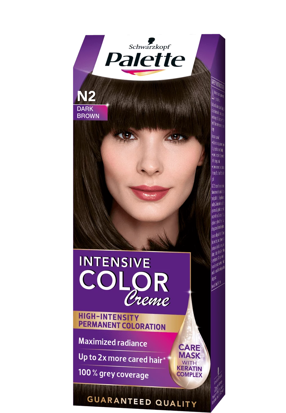 A sötétbarna árnyalatú Palette Intensive Color Creme hajfesték optimális őszhajfedést biztosít, és az intenzív, tartós színeredményről is gondoskodik. A formula mélyen behatol a hajba, miközben a haj szerkezetébe zárja az intenzív festék pigmenteket, ezzel biztosítva a fantasztikus ragyogást. A gazdag ápoló hajbalzsam keratin komplexszel intenzív, extra ápoló hatást nyújt hajfestés után.* Erősebb, lágyabb haj és pazar ragyogás. Élvezze a kényeztető virágillatot. *az előző formulához képest Teljesen ősz hajra is ajánlott. A doboz elején látható modell hajának színe a bekeretezett természetes hajszínen elért színeredményt mutatja. Válassza azt a hajfestéket, ami annyi ideig tart, ameddig Ön szeretné!
