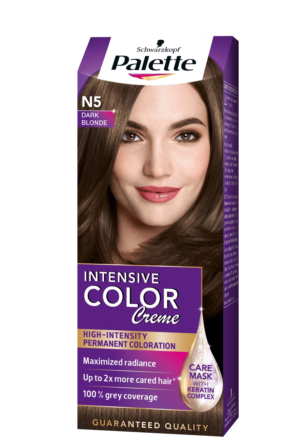 A Schwarzkopf Palette Intensive Color Creme 6-0 sötétszőke (N5) intenzív krémhajfesték formulája mélyen behatol a hajszerkezetbe és magába zárja a magas intenzitású színpigmenteket a fakulás elleni védelemért. Ezzel heteken át tartó, hosszú színintenzitás és árnyalattól függő őszhajfedést tesz lehetővé. A keratint, panthenolt és nutri-olajat tartalmazó hajbalzsam ápolja a festett hajat. Teljesen ősz hajra is ajánlott. A doboz elején látható modell hajának színe a középső természetes hajszínen elért színeredményt mutatja.