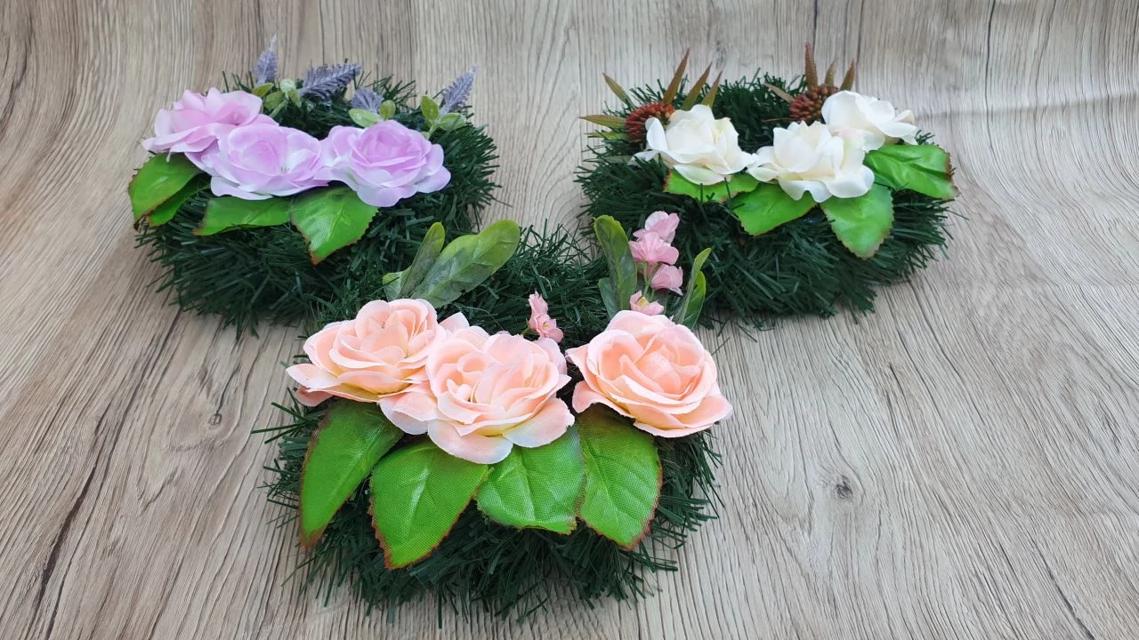 Mindenszentek napi díszített koszorú, 15 cm átmérőjű.