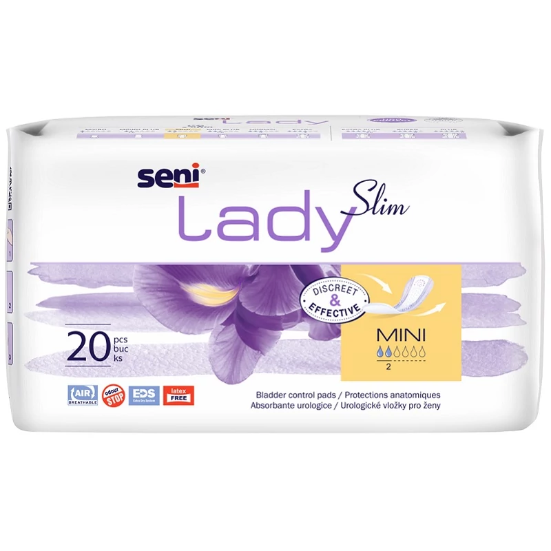 A csepegéses és enyhe fokú inkontinenciát tapasztaló nő választása a SENI LADY Slim Mini méretű inkontinencia betét. Kényelmet és diszkrét védelmet kínál. Használatával az inkontinens nő életminősége javítható. Mindig friss érzetet biztosít viselőjének. Felső rétege a nagyobb mennyiségű folyadékot (vizelet, szülés utáni váladék) is gyorsan elvezeti, majd nem engedi visszanedvesedni, így felszíne száraz marad.