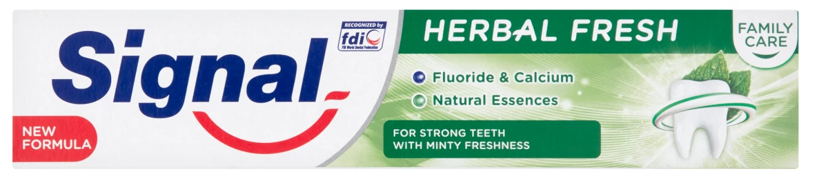 A Signal Family Care Herbal Fresh fogkrém olyan természetes eredetű, frissítő tulajdonságairól ismert növényi kivonatok gazdag keverékét tartalmazza, mint a menta, zsálya, mirha és eukaliptusz. Harcol a rossz lehelet ellen és hosszan tartó friss érzést biztosít. Erősebb fogak fogszuvasodás elleni védelemmel. Segíti a fogakat alapvető összetevőikkel, fluoriddal és kálciummal feltölteni, hogy hosszú ideig erősek maradhassanak és segít eltávolítani a fogakon kialakuló foltokat.