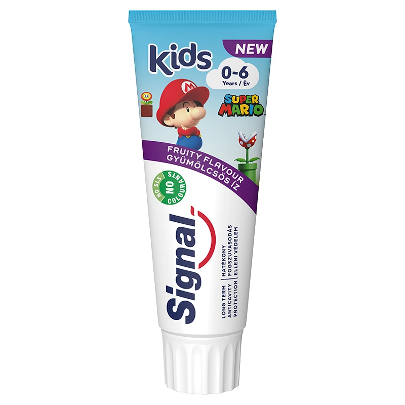 A 0-6 éves gyerekeknek ajánlott Signal Kids Gyümölcsös fogkrém formulája gyengéd fogínyhez és a fogzománchoz. A gyerekek számára megfelelő fluorid mennyiség segít megerősíteni a fogaikat.
