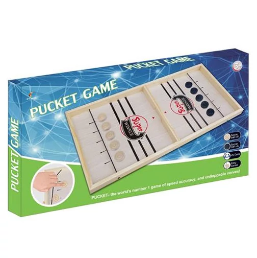 A Sling Puck egy nálunk kevésbé ismert ügyességi játék, pedig az egyszerűsége és a gyorsasága miatt remek választás és egyúttal nagyszerű kikapcsolódás is. A fakeretes játéktábla két részre van osztva, középen egy kis kapuval kialakított elválasztóval. Mindkét játékos azonos számú koronggal kezdi a játékot, amit a saját játékterén kifeszített gumival kell a kis kapunk keresztül az ellenfél oldalára lőni. A játékot az nyeri, akinek a térfelén előbb fogy el az összes korong, beleértve az ellenfél által már átlőtt darabokat is. A Sling Puck egy remek partijáték ami fejleszti a szem-kéz koordinációt és az ügyességet, ráadásul komoly versenyeket is szoktak szervezni.